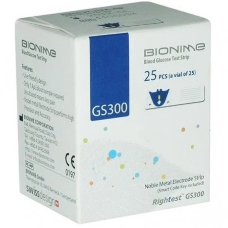 Ce paquet contient 25 bandelettes Bionime GS300 test strips Rightest, compatibles avec le glucomètre GS300 de Bionime. Elles sont introduites latéralement au glucomètre pour une meilleure maniabilité. Grâce à un format rigide et une grande taille, ces bandelettes facilitent considérablement la prise du sang et la mesure des niveaux glycémiques quotidiens.