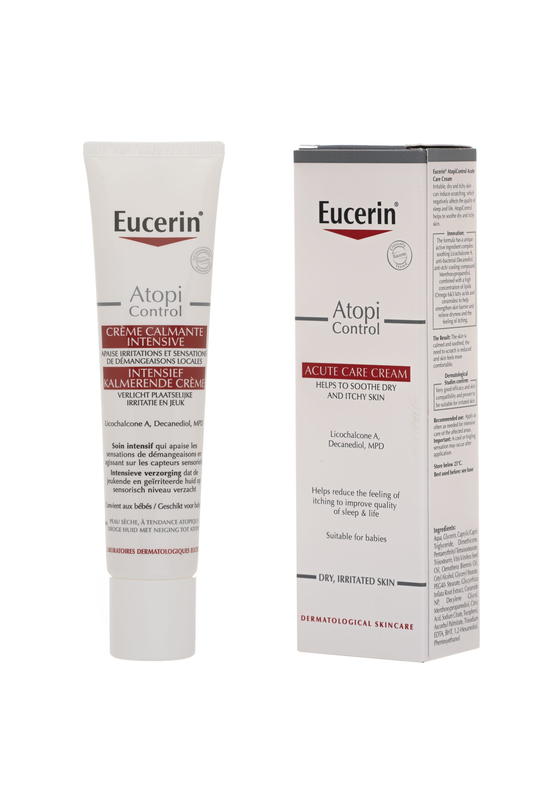 La crème Atopicontrol Intensive, produite par Eucerin, soulage les peaux irritées et desséchées, et élimine les sensations d’inconfort cutané grâce à son soin hydratant et calmant. Ce soin atténue les sensations de démangeaisons, qui provoquent généralement le besoin de se gratter, ce qui est susceptible d’aggraver les symptômes. Grâce à sa teneur en Licochalcone A, cette crème apaise et rafraîchit l’épiderme, favorisant son équilibre physiologique.