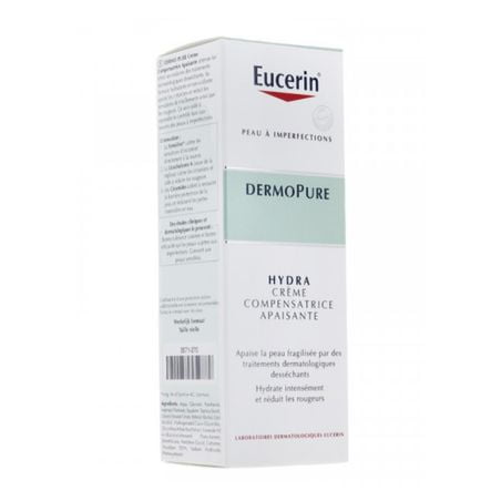 La crème compensatrice apaisante Eucerin Dermopure Hydra apporte un soin hydratant intense, convenable aux peaux sèches, atopiques ou assoiffées par traitement dermatologique. Elle aide notamment à fortifier la peau après dessèchement, et à relipider sa barrière protectrice. Sa texture soyeuse et onctueuse apaise contre les irritations et les tiraillements grâce à sa formule équilibrée.