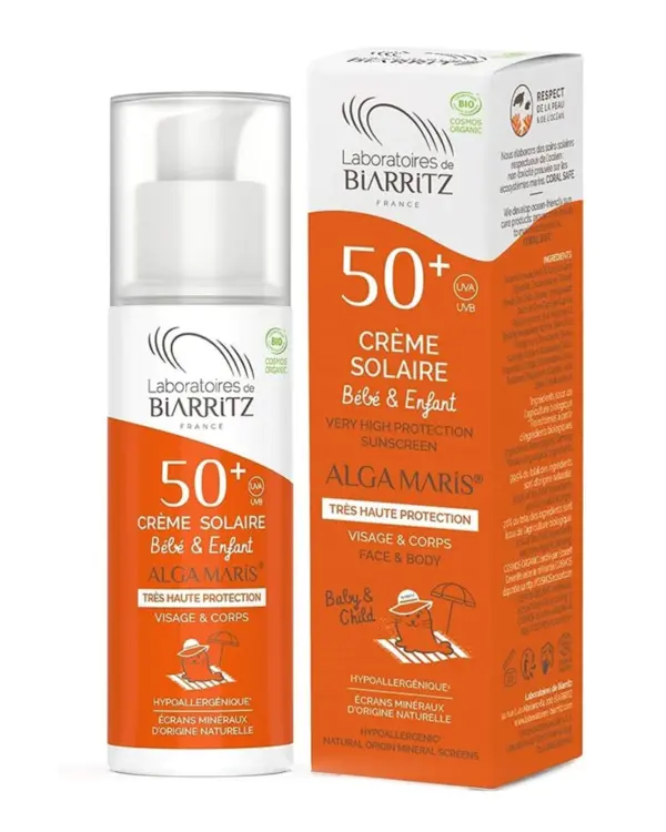 Crème Solaire Bébé et Enfants SPF50 pour une protection cellulaire optimale tout en étant hypoallergénique, sans parfum.