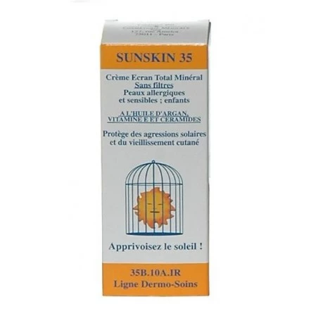 Dermo-Soins Sunskin 35 Crème Solaire est une crème solaire totale sans filtre chimique contenant : écran minéral protection UVA-UVB-IR, Huile d’Argan, Vitamine E, Céramides et acide beta-glycyrhétinique