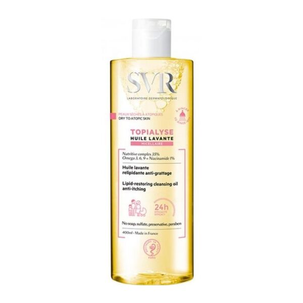 L’huile lavante micellaire Topialyse a été développée par les Laboratoires SVR pour nettoyer en douceur les peaux sèches et atopiques des adultes, mais aussi des enfants et des nourrissons.