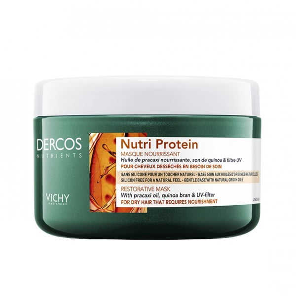 Le masque Vichy Dercos Nutrients Nutri Protein apporte un soin imparable aux cheveux secs et sensibles, et nourrit la fibre capillaire pour un effet de soin durable. Constitué de l’huile de pracaxi et du quinoa, ce masque capillaire agit directement sur le cuir chevelu, favorisant la nutrition naturelle des cheveux, et aide aussi à les réparer des dommages induits par le dessèchement.
